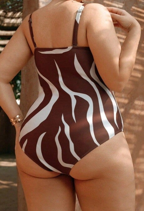 Der Badeanzug besticht durch sein schickes braun-weißes Zebramuster, das sofort ins Auge fällt und dir einen sophisticated Look verleiht. Das Design mit geradem Bandeau-Ausschnitt und verstellbaren Spaghettiträgern bietet optimalen Halt und eine individuelle Passform, während es gleichzeitig die Schultern elegant betont.