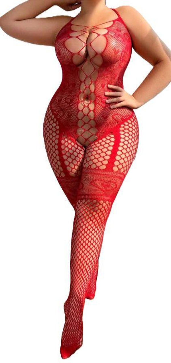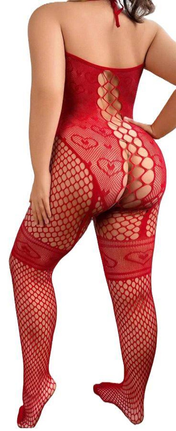 Dieser Körper Strumpf besticht durch sein hoch-dehnbares, durchsichtiges Netzmaterial in einem intensiven Rot. Er kombiniert ein feingliedriges Netzgewebe über dem Großteil des Körpers mit romantischen, blickdichteren Herzmustern an Oberschenkeln und Brust, was einen aufregenden Kontrast schafft.