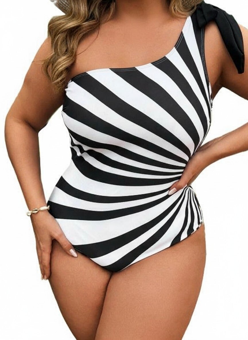 Das Herzstück dieses Einteilers ist das Schwarz-Weiße, gestreifte Muster, das in einem dynamischen, strahlenförmigen Farbblock verläuft und so eine optisch schmeichelhafte Hohe Taille erzeugt. Der moderne One-Shoulder Ausschnitt wird durch ein elegantes Detail aus Knoten und Zwirn am Träger akzentuiert (Kreuzgurt-Detail).